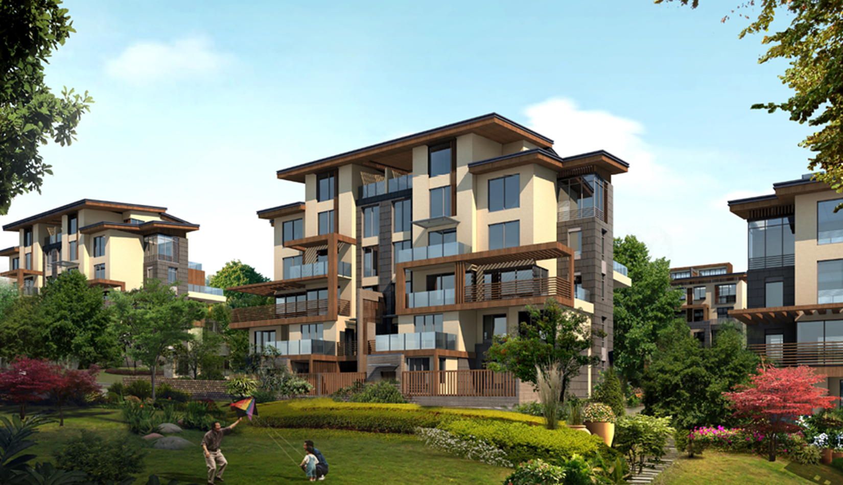 與北部組團(tuán)形成對比,南面的地塊引入了一系列的圍合式院落布局。建筑物圍繞組團(tuán)中心花園布局。不同的花園有不同的植物和水景主題,統(tǒng)一中包含個性。