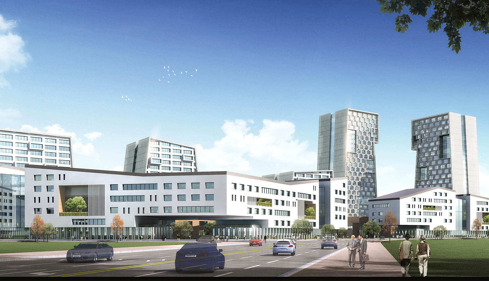 為了打造一個完美的城市沿街形象,以及營造一個安靜舒適的工作與休閑空間,我們采用了半圍合的規(guī)劃布局,北側(cè)高層建筑基本成“一”字布局,高低錯落,塑造完美的城市天際線,宛如一條盤旋上升的巨龍;在南側(cè)一個個長方形建筑成折線型連續(xù)排列,隔離周邊嘈雜的城市環(huán)境,猶如越出水面的“金鱗”,中央景觀帶東西側(cè)以友好的姿態(tài)向城市開放,美化城市形象。\