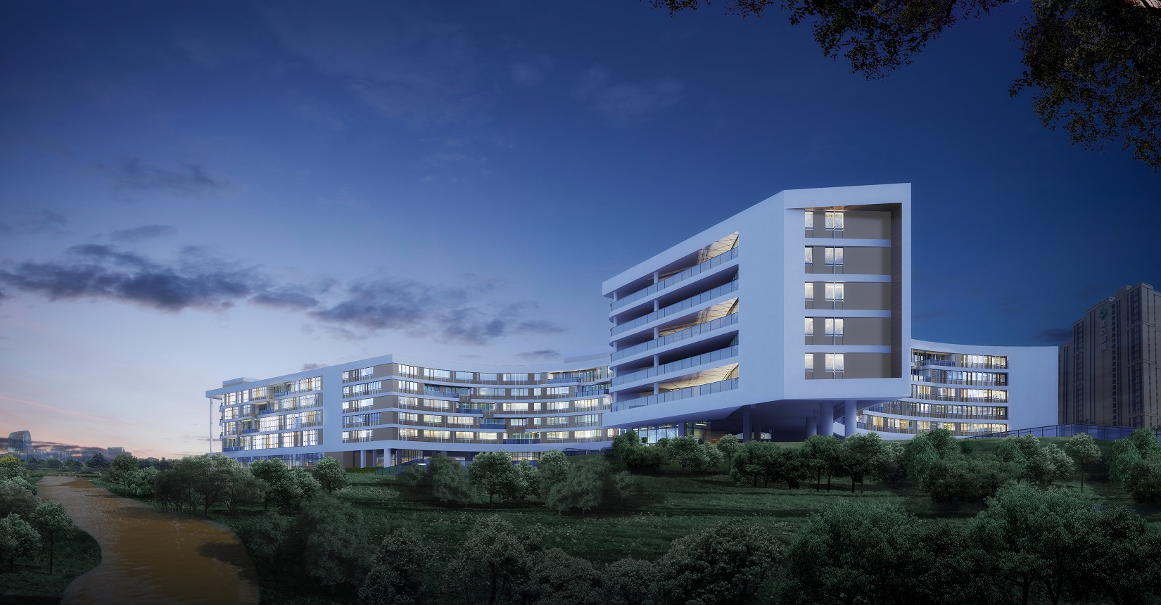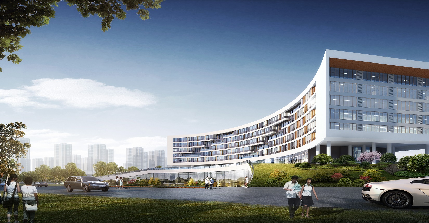 考慮到用地形狀、使用功能和日照等條件因素的影響,總平面布局以“生長”為主題,寓意生命向上生長的力量,生生不息,無限伸展。枝杈無限分支向上生長,象征著無限的力量與生機。而中醫(yī)的健康講究氣血通暢,循環(huán)往復,從而衍生出“五行”相輔相成的設(shè)計理念。根據(jù)五行方位確定五行主題。將金水湖與建筑相融合,金水湖為“水”,輔“金”“木”“火”“土”四個主題廣場。