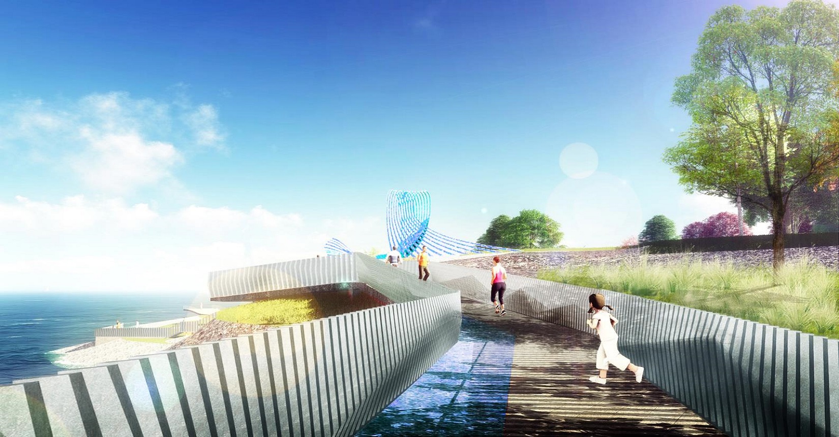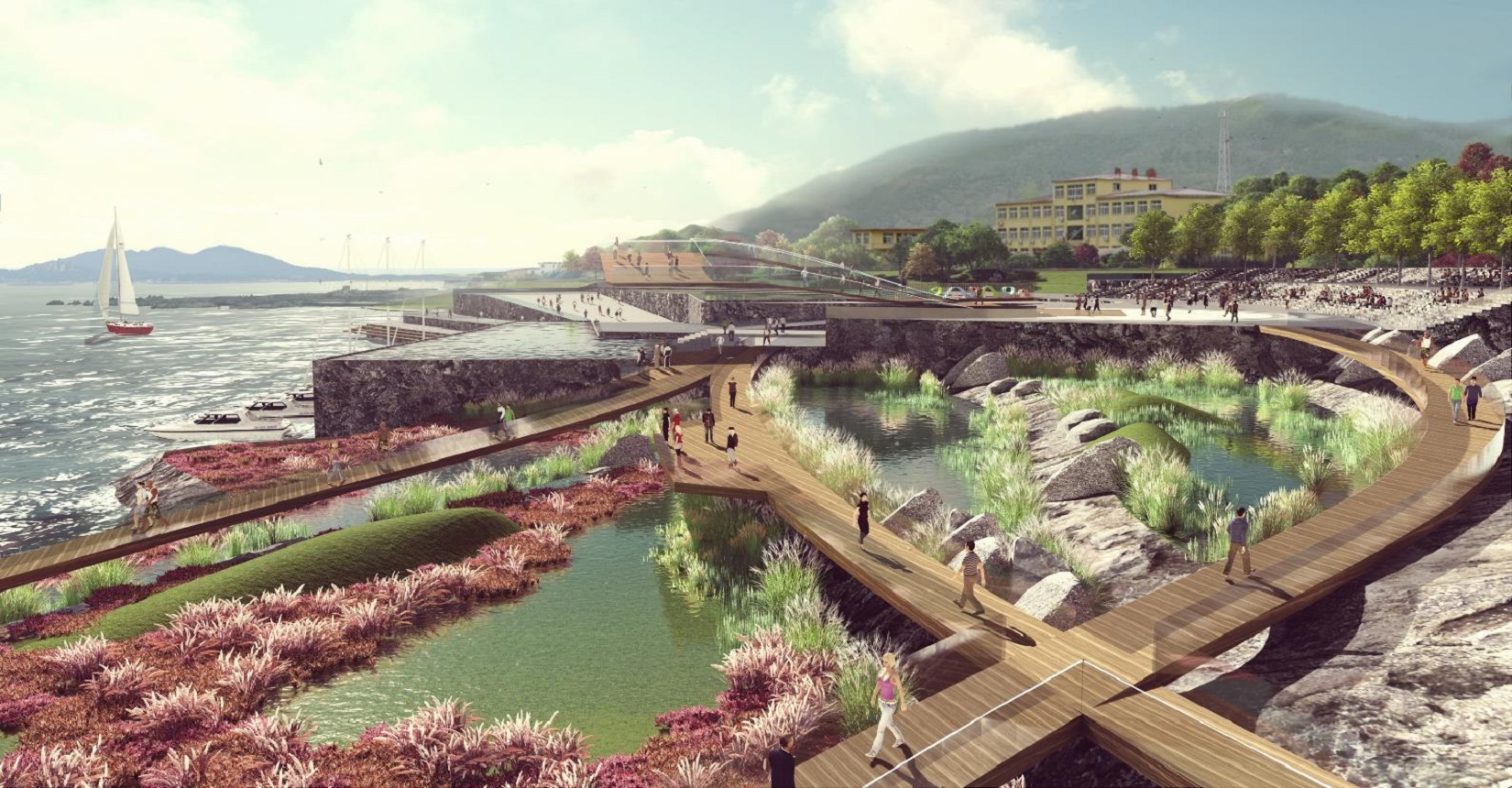 該項目以露天海洋科技博物館為設計理念,打造一個集生態(tài)保育、展示教育、科學科普、交流傳播、旅游觀光等功能于一體的國家級愛國主義教育基地。設計是以地域性、生態(tài)性、智慧性為指導原則,將整個海岸帶劃分為五個分區(qū)進行設計,包含了科研、文教、生活三個方面,重塑海洋價值觀,打造一個海洋科技交流平臺。